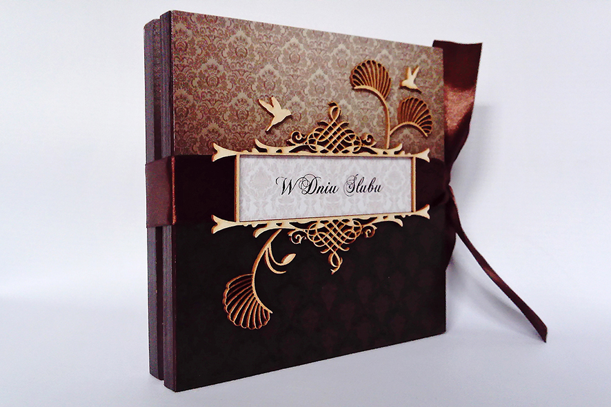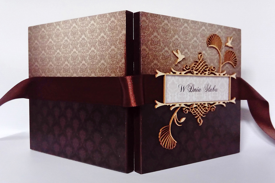 Nietypowa kartka z okazji ślubu, ręcznie robiona w formie drewnianego pudełka. Wykonana techniką decoupage, zdobiona metodą scrapbooking. Malowana farbami akrylowymi oraz pokryta dwukrotnie lakierem bezbarwnym – wodnym, półmatowym. Wiązana na kokardę. Wewnątrz życzenia i miejsce na odręczny podpis, po drugiej stronie mała koperta, która pomieści sporo pieniążków, drobny prezent czy też kartę upominkową.