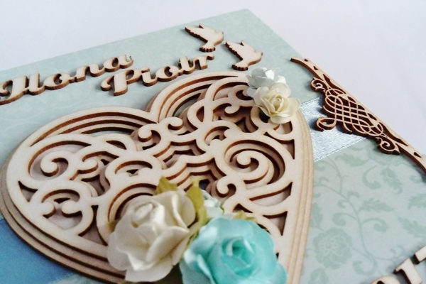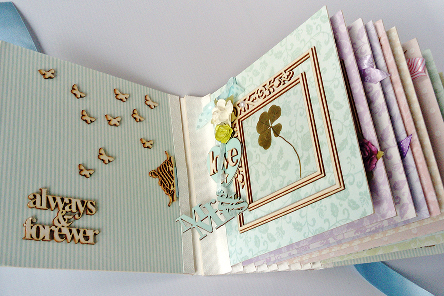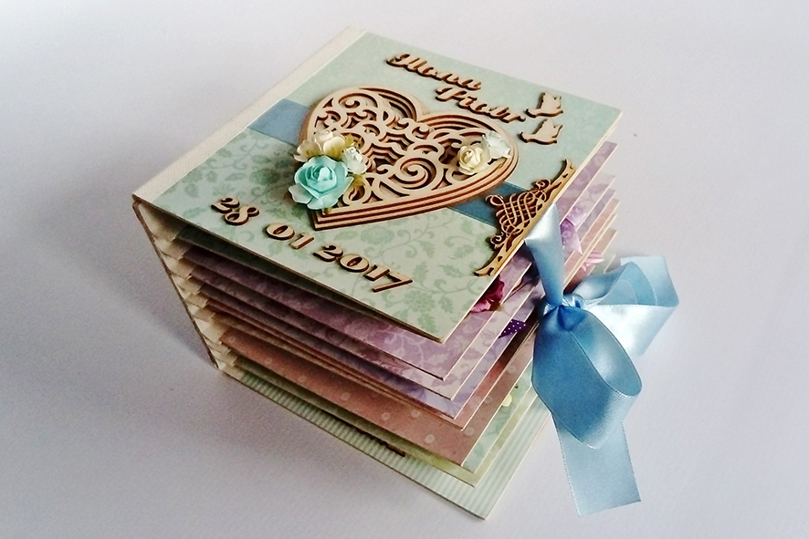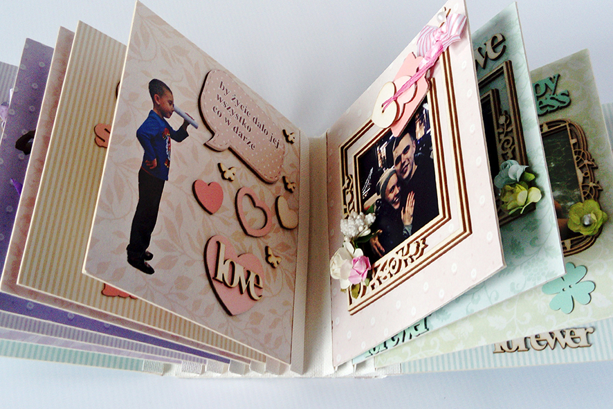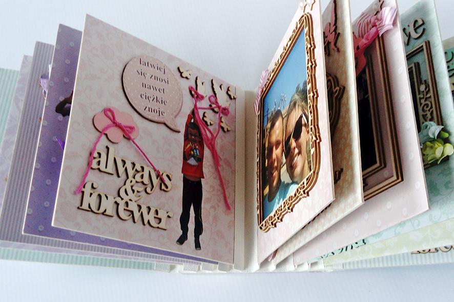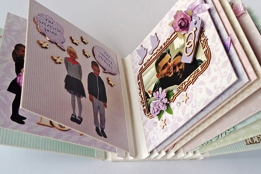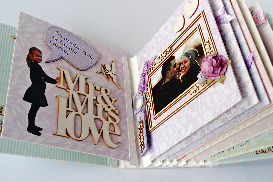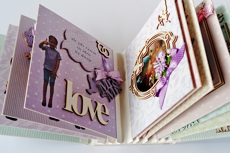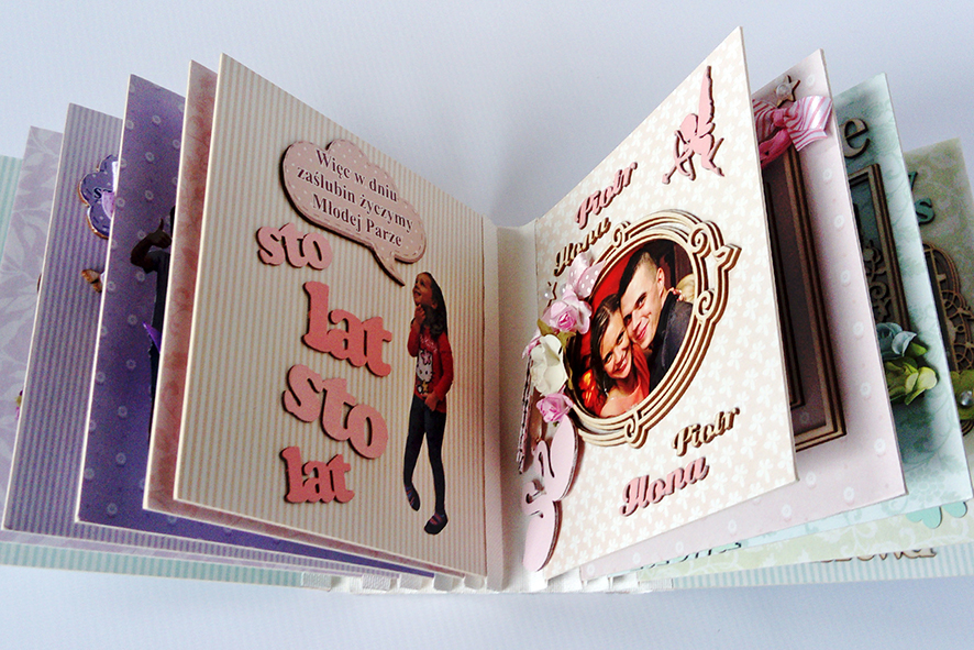 Scrabookingowy album ślubny. Wiązany na kokardę. Życzenia zdobione licznymi elementami dekoracyjnymi. Zdjęcia umieszczone w ramkach 3D. Zamknięty w kartonowym pudełku wykonanym pod wymiar.