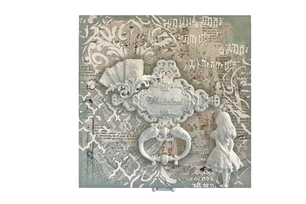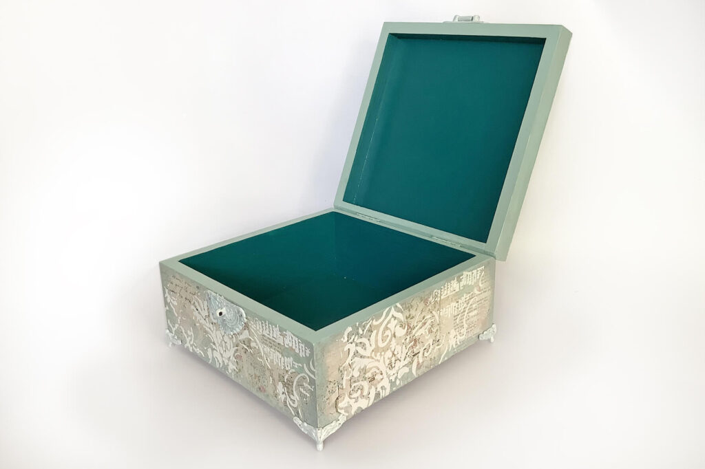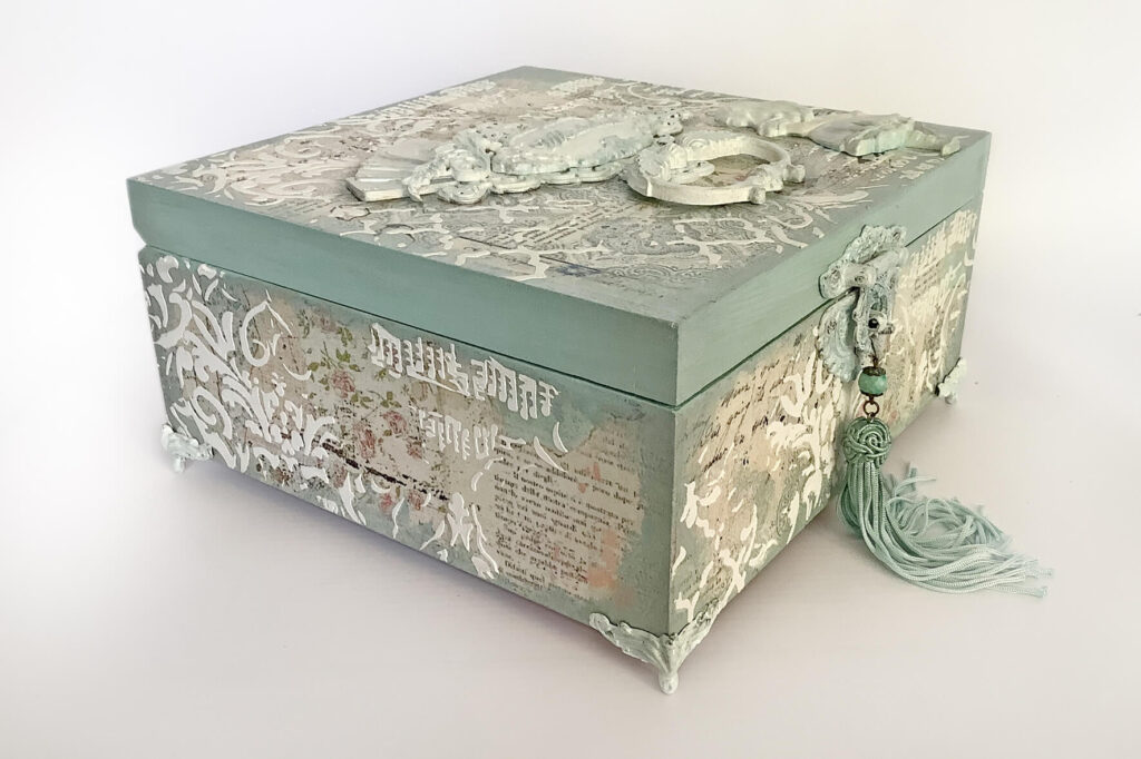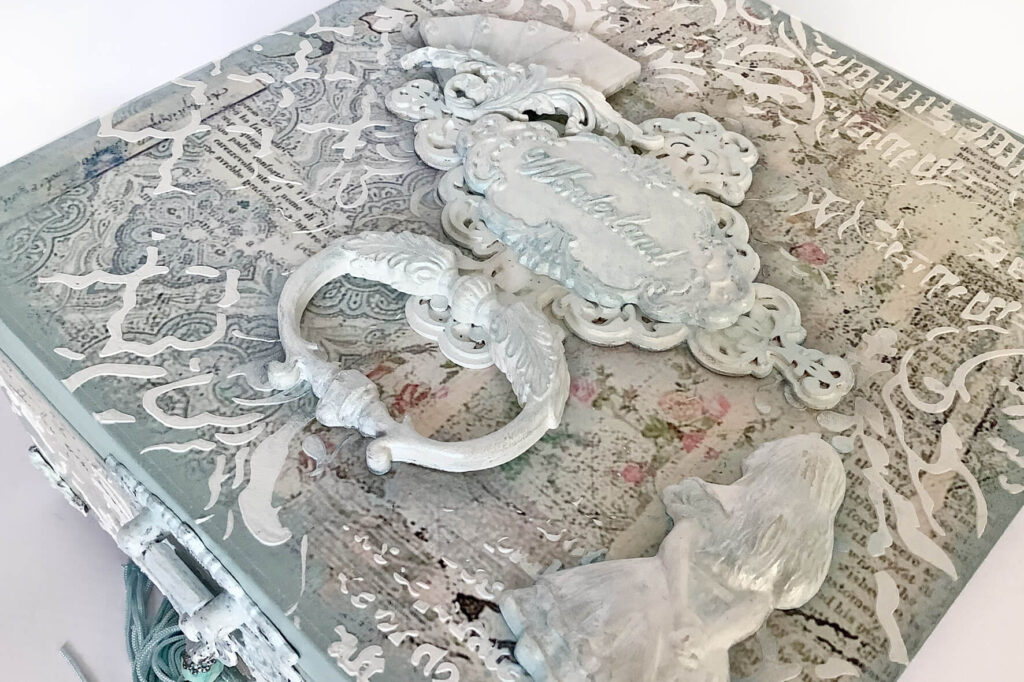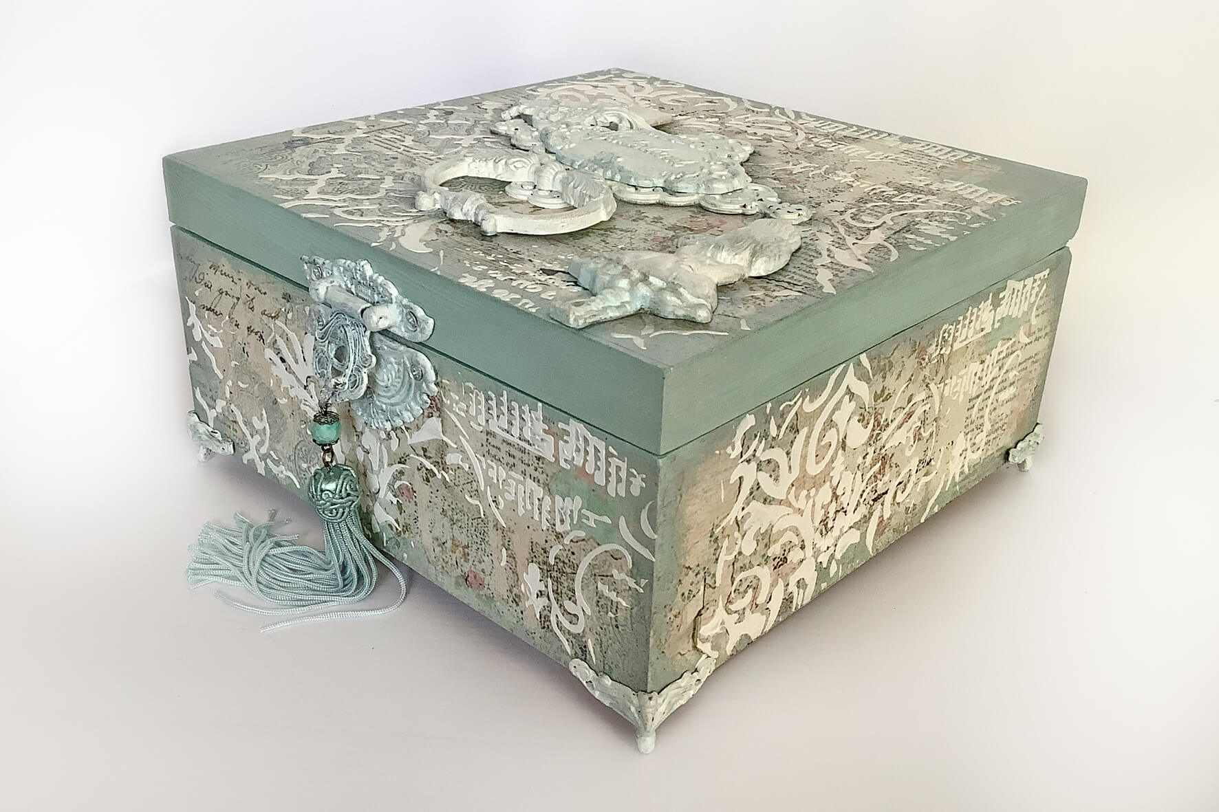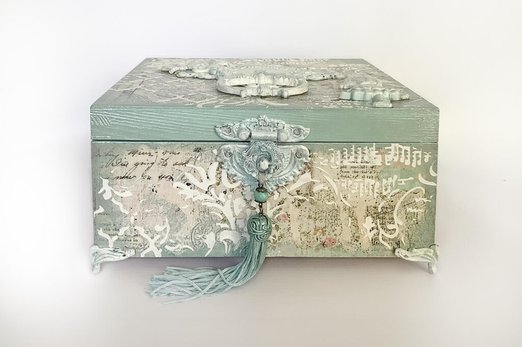 Drewniane pudełko zdobione techniką decoupage. Malowane farbami akrylowymi i pokryte lakierem satynowym. Całość zdobią elementy 3D oraz ozdobne metalowe zapięcie z unikatowym wisiorem.