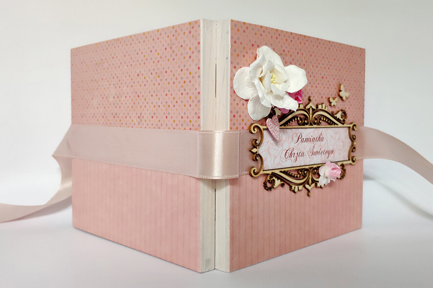 Nietypowa kartka z okazji chrztu świętego, ręcznie robiona w formie drewnianego pudełka. Wykonana techniką decoupage, zdobiona metodą scrapbooking. Malowana farbami akrylowymi oraz pokryta dwukrotnie lakierem bezbarwnym – wodnym, półmatowym. Wiązana na kokardę. Wewnątrz życzenia i miejsce na odręczny podpis, po drugiej stronie mała koperta, która pomieści sporo pieniążków, drobny prezent czy też kartę upominkową.