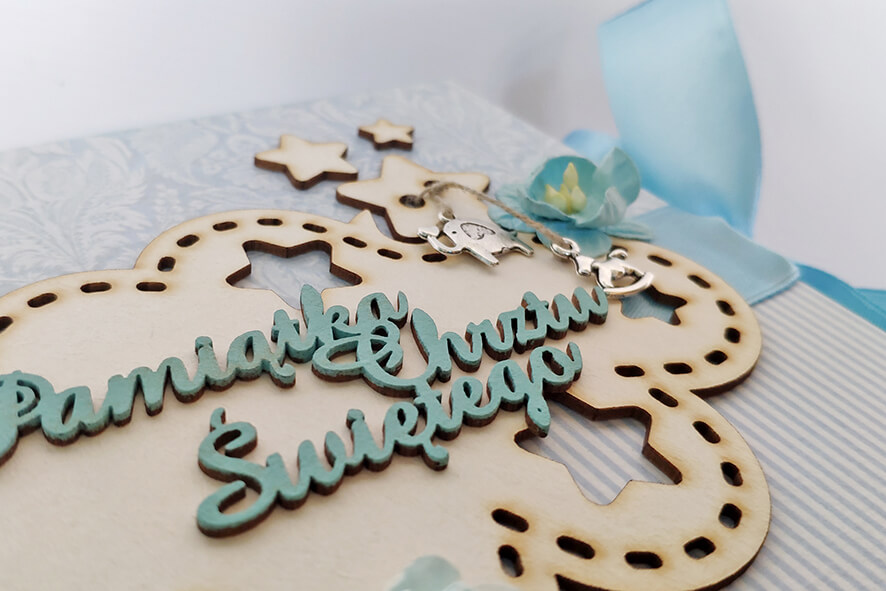 Nietypowa kartka z okazji chrztu świętego, ręcznie robiona w formie drewnianego pudełka. Wykonana techniką decoupage, zdobiona metodą scrapbooking. Malowana farbami akrylowymi oraz pokryta dwukrotnie lakierem bezbarwnym – wodnym, półmatowym. Wiązana na kokardę. Wewnątrz życzenia i miejsce na odręczny podpis, po drugiej stronie mała koperta, która pomieści sporo pieniążków, drobny prezent czy też kartę upominkową.
