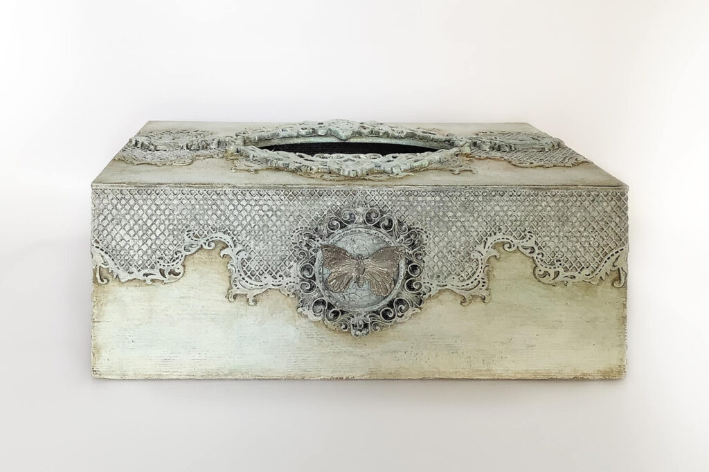 Drewniane pudełko na chusteczki z wysuwanym dnem, wykonane techniką decoupage. Malowane farbami akrylowymi i pokryte lakierem satynowym. Całość zdobią elementy 3D.