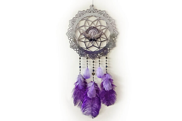 Fiołkowy łapacz snów Rozmiar: 30 cm x 30 cm x 1 cm (Dł. x Szer. x Wys.) Opis Łapacz snów w fioletach. Wykonany techniką decoupage i mix media. Zdobiony pięknymi piórami. << wróć do listy