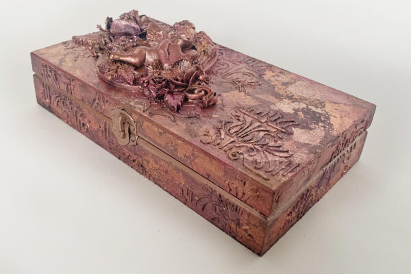 Pudełko na pieniądze z okazji Ślubu. Stworzone gdy chcesz w elegancki sposób wręczyć prezent w postaci pieniędzy. Wykonane techniką decoupage i mix media. Malowane farbami akrylowymi oraz pokryte płatkami złota. Zabezpieczone dwukrotnie lakierem bezbarwnym – wodnym, półmatowym. Zapinane na ozdobne zapięcie. Wewnątrz życzenia.