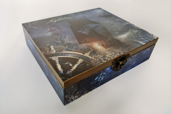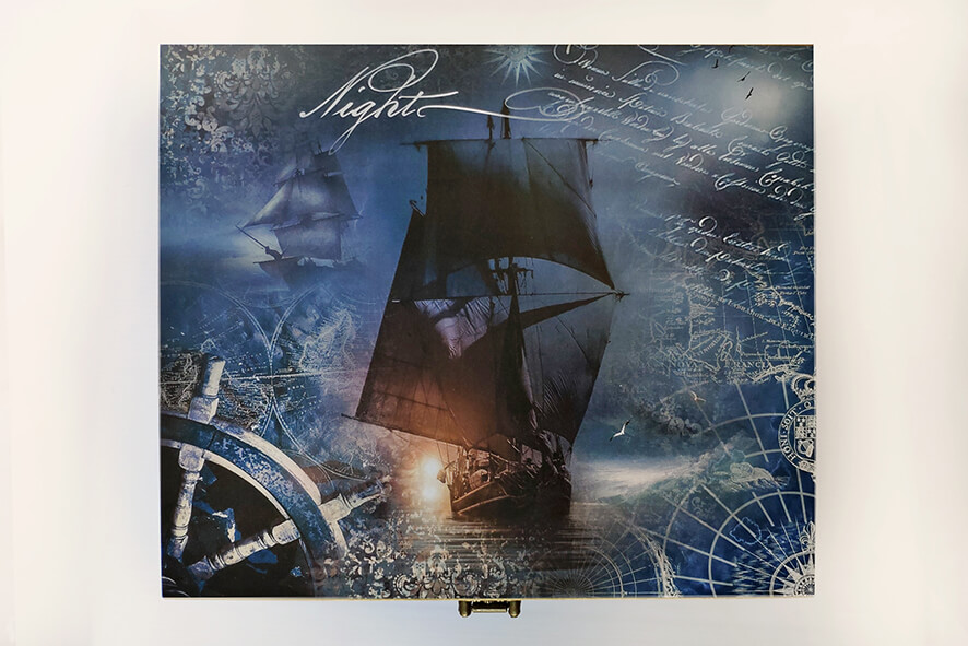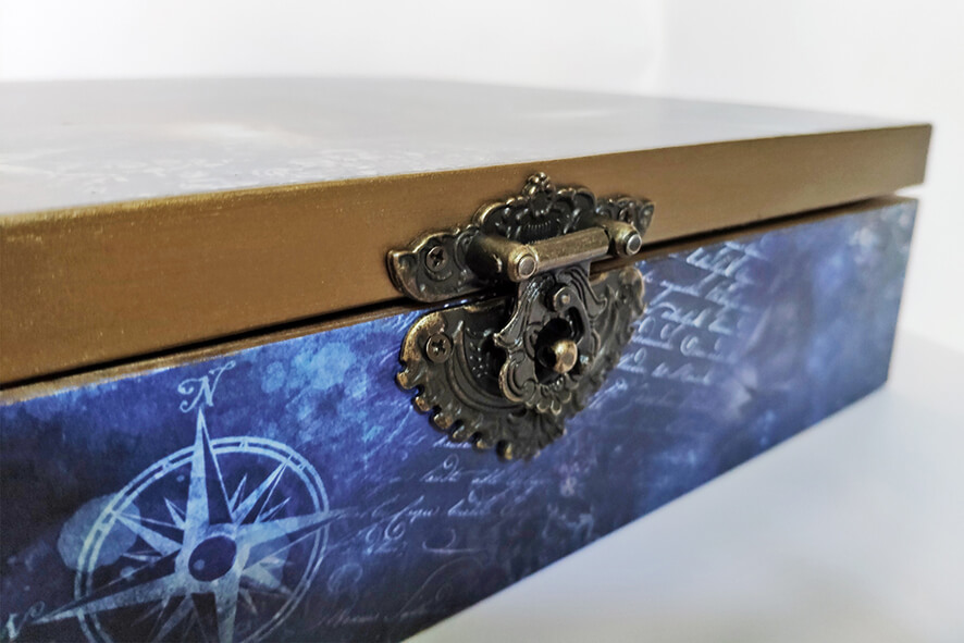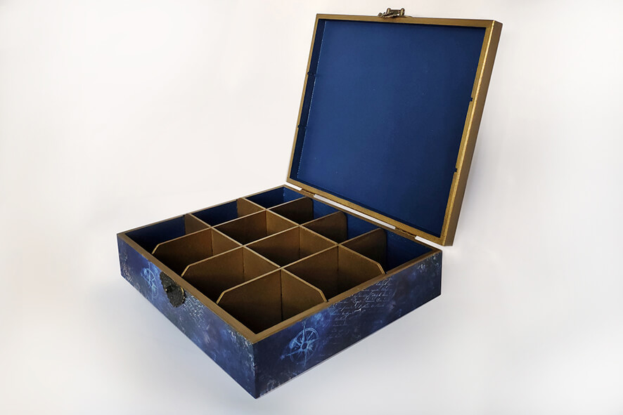 Herbaciarka na 12 przegródek zdobiona techniką decoupage. Malowana farbami akrylowymi i pokryta lakierem satynowym. Całość zdobi ozdobne metalowe zapięcie.