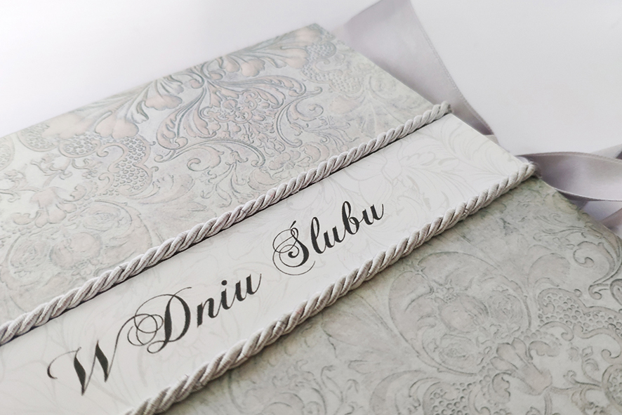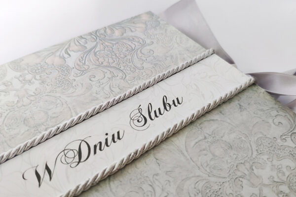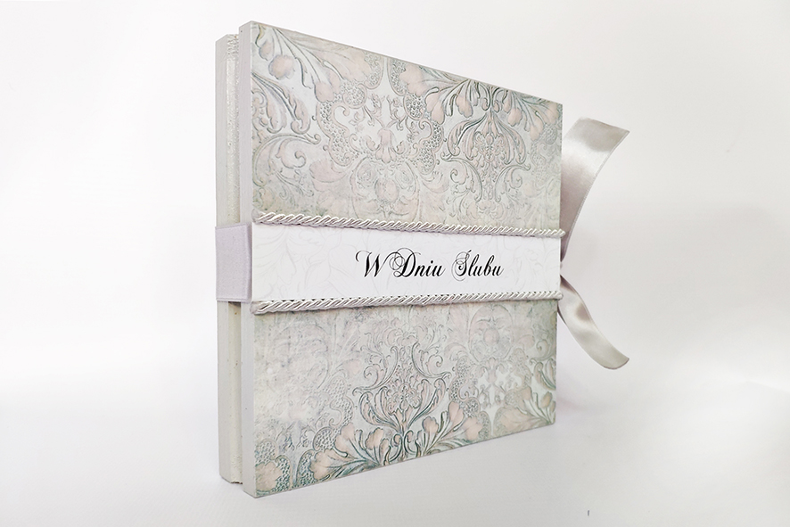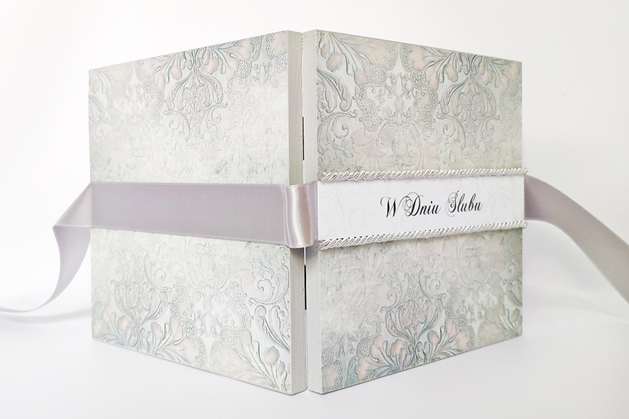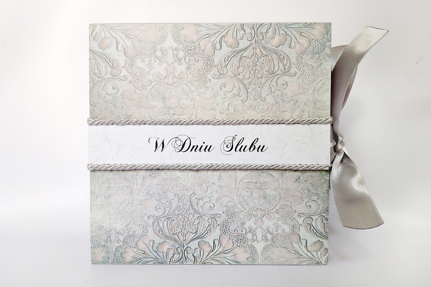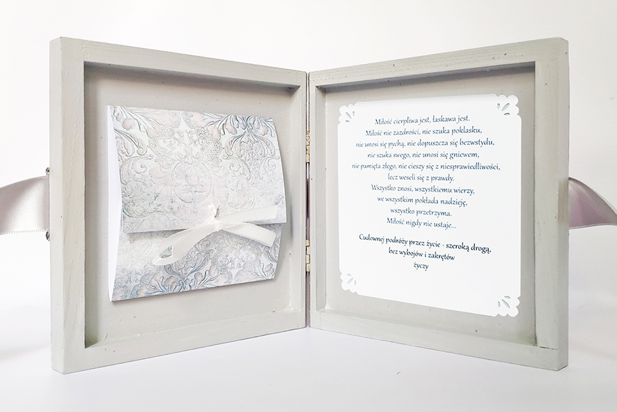 Nietypowa kartka z okazji ślubu, ręcznie robiona w formie drewnianego pudełka. Wykonana techniką decoupage, zdobiona metodą scrapbooking. Malowana farbami akrylowymi oraz pokryta dwukrotnie lakierem bezbarwnym – wodnym, półmatowym. Wiązana na kokardę. Wewnątrz życzenia i miejsce na odręczny podpis, po drugiej stronie mała koperta, która pomieści sporo pieniążków, drobny prezent czy też kartę upominkową.