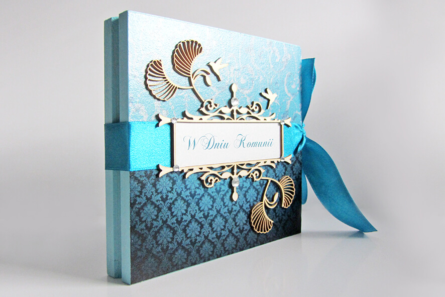 Nietypowa kartka z okazji komunii świętej, ręcznie robiona w formie drewnianego pudełka. Wykonana techniką decoupage, zdobiona metodą scrapbooking. Malowana farbami akrylowymi oraz pokryta dwukrotnie lakierem bezbarwnym – wodnym, półmatowym. Wiązana na kokardę. Wewnątrz życzenia i miejsce na odręczny podpis, po drugiej stronie mała koperta, która pomieści sporo pieniążków, drobny prezent czy też kartę upominkową.