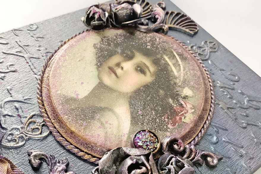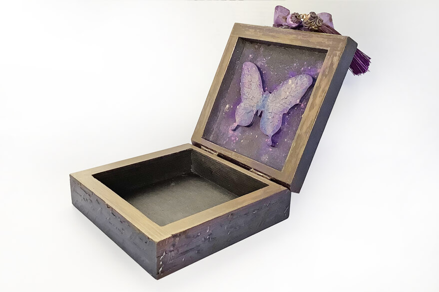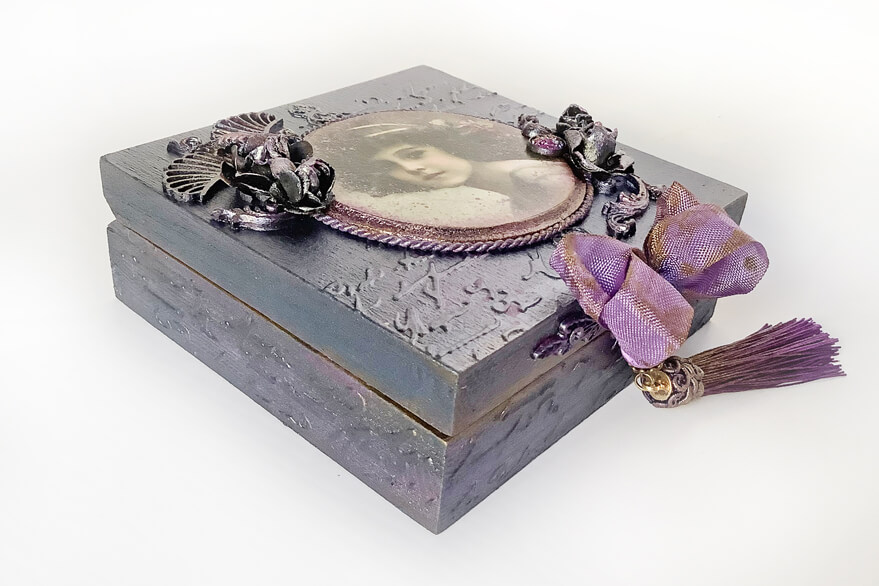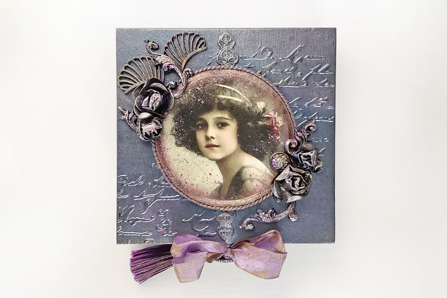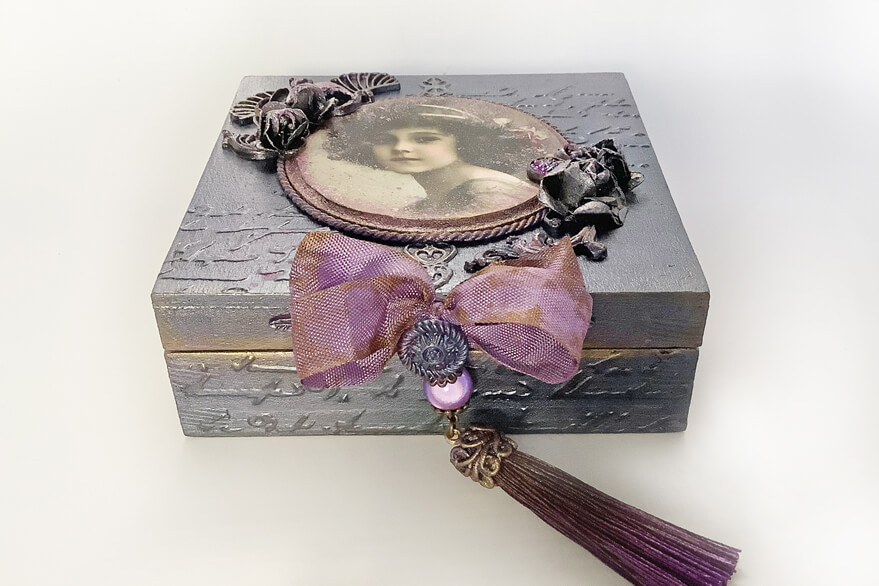 Małe pudełko w stylu vintage. Ozdobione techniką decoupage i elementami dekoracyjnymi 3D. Malowane metalicznymi farbami akrylowymi i pokryte satynowym lakierem wodnym. Całość zdobi metalowy uchwyt z zawieszką.
