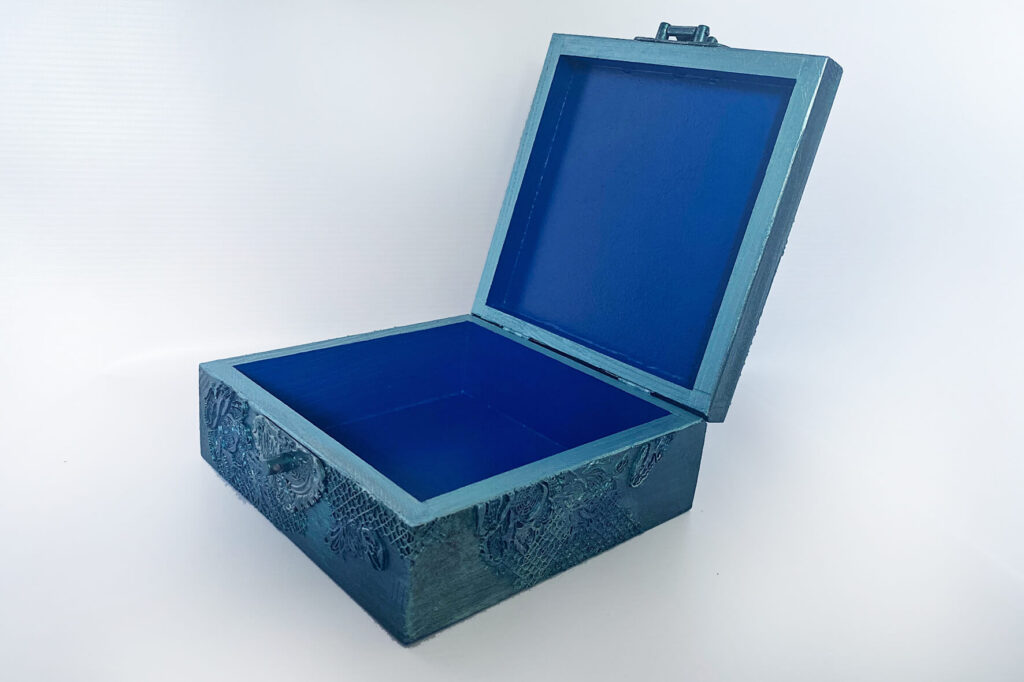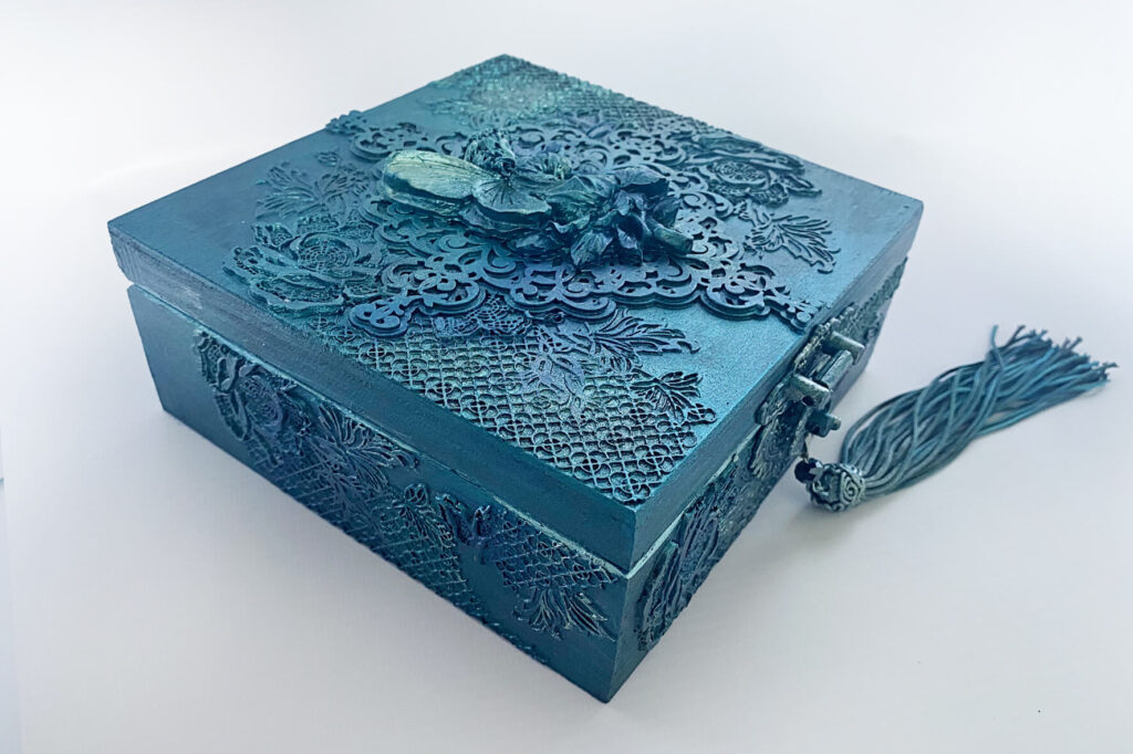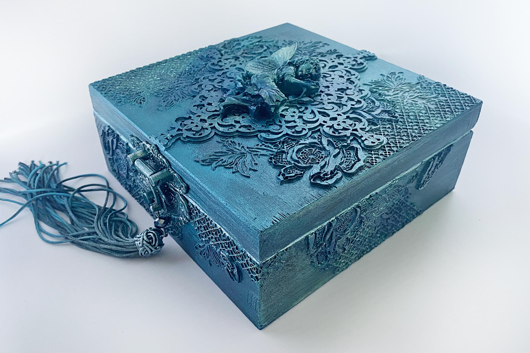 Pudełko metaliczny granat z wróżką. Wykonane w technice mix media i decoupage. Malowane farbami akrylowymi i pokryte satynowym lakierem na bazie wody. Metaliczne farby oraz płatki srebra podkreślają charakter pudełka. Całość ozdobiona metalowym zapięciem z chwostem.