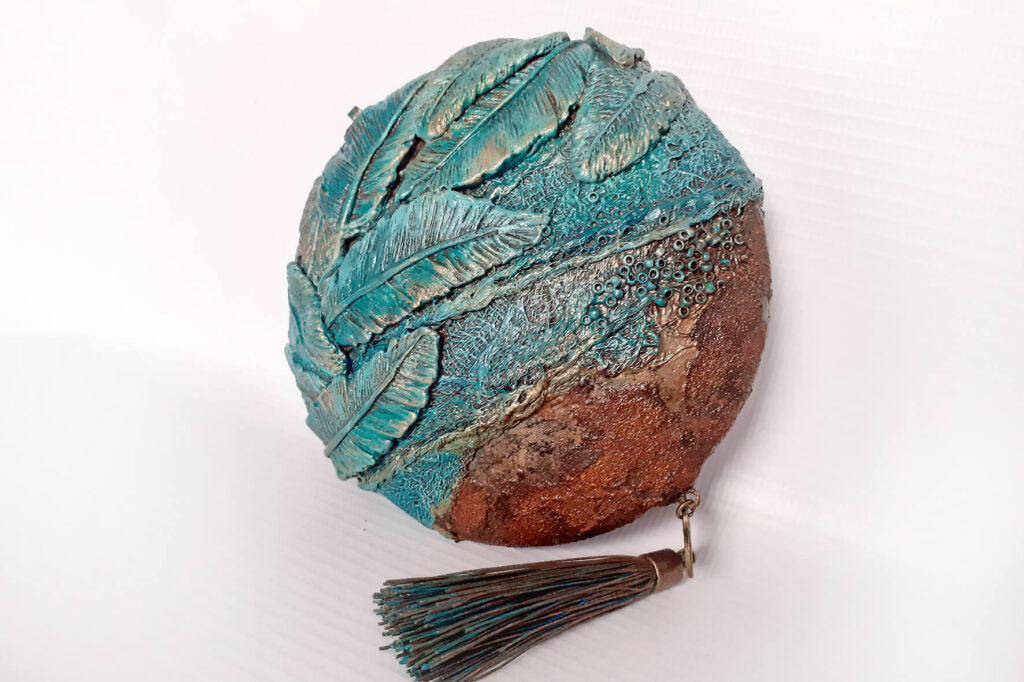 Miedziany medalion Rozmiar: 10 cm x 10 cm x 5 cm (Dł. x Szer. x Wys.) Opis Unikatowa miedziana bombka ozdobiona techniką mix media. << wróć do listy