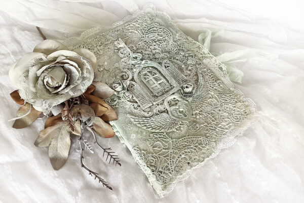 Wykonany techniką decoupage i mix media. Bogato zdobiony.