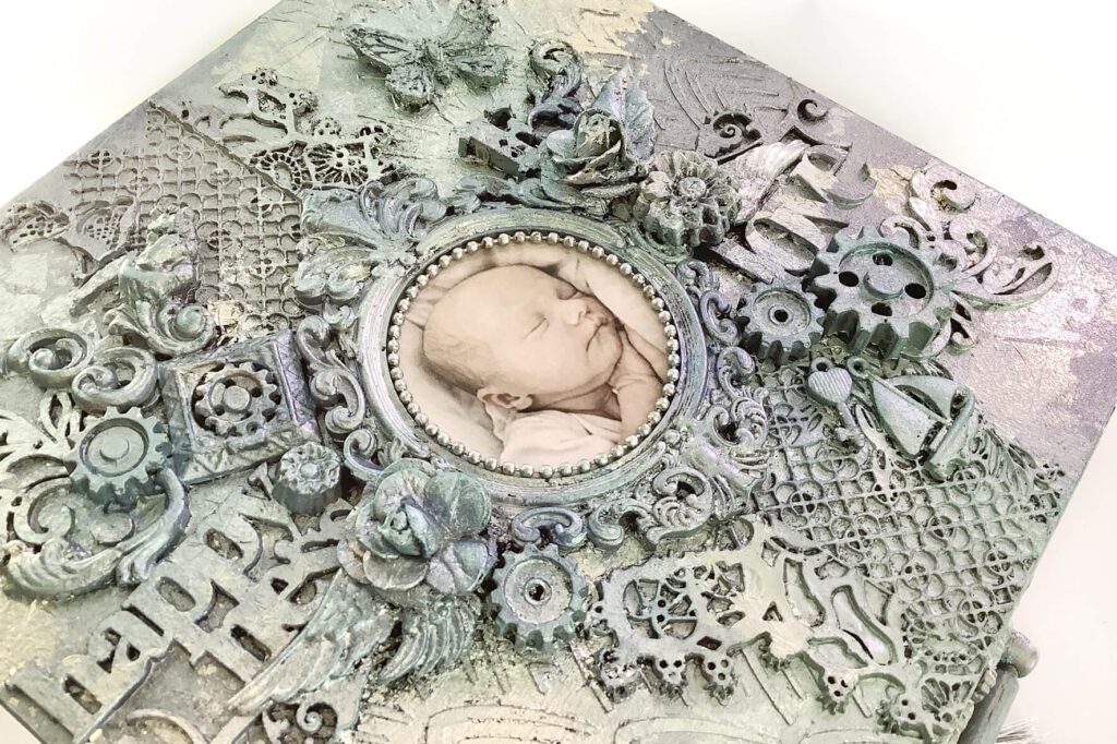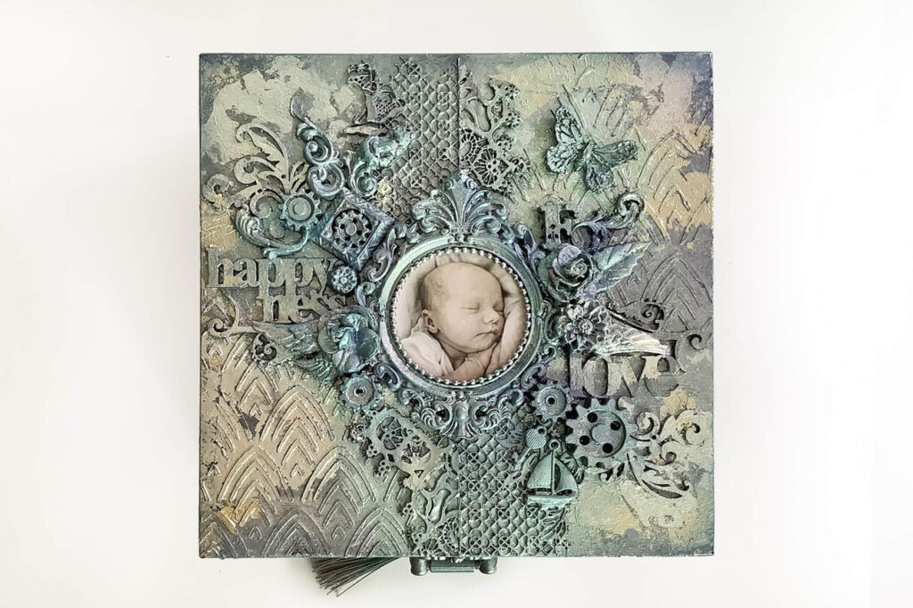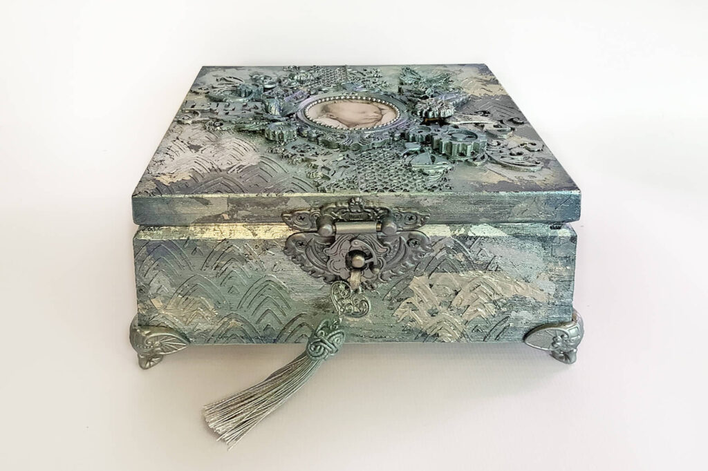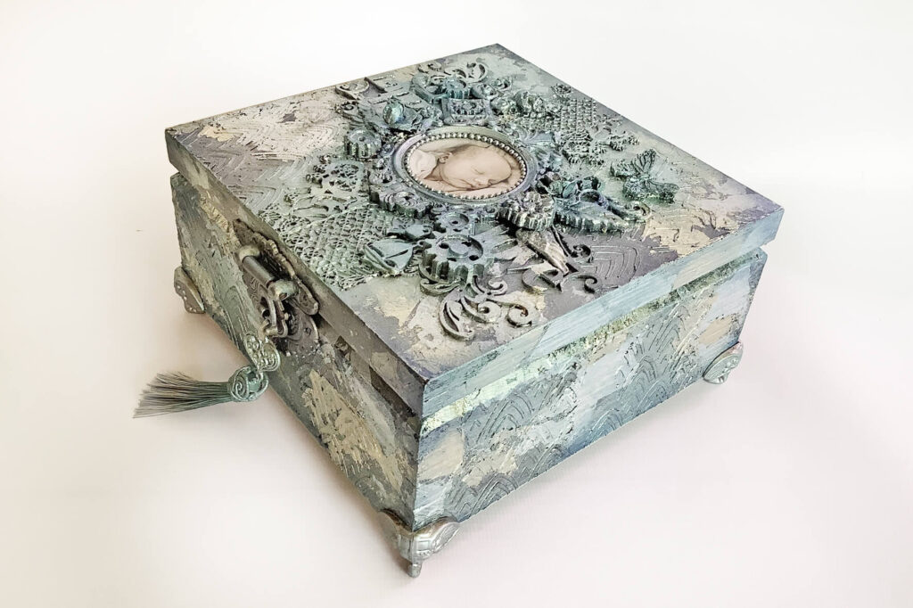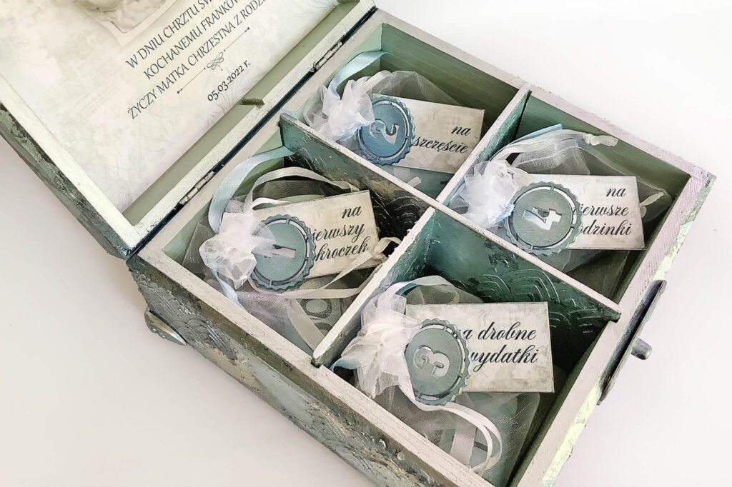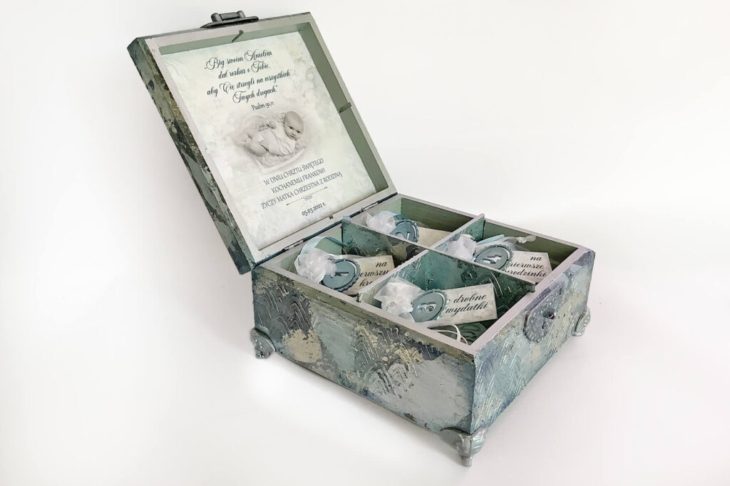 Pudełko wykonane w technice mix media, decoupage. Malowane farbami akrylowymi i pokryte satynowym lakierem na bazie wody. Metaliczne farby oraz płatki srebra podkreślają charakter pudełka. Całość ozdobiona metalowym zapięciem z chwostem. Pudełko wykonane na specjalne zamówienie z okazji Chrztu.