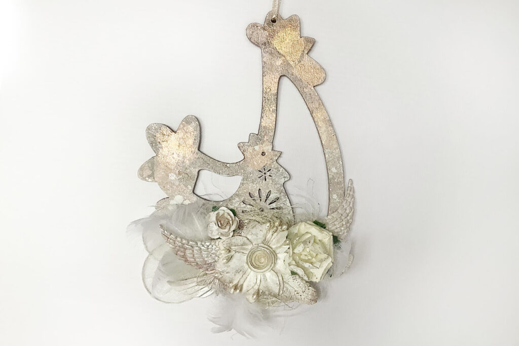 Pastelowe kurki Rozmiar: 2 cm x 24 cm x 16 cm (Dł. x Szer. x Wys.) Opis Dekoracyjna wielkanocna zawieszka – pastelowe kurki. Zawieszka wykonana metodą decoupage i mixmedia. << wróć do listy