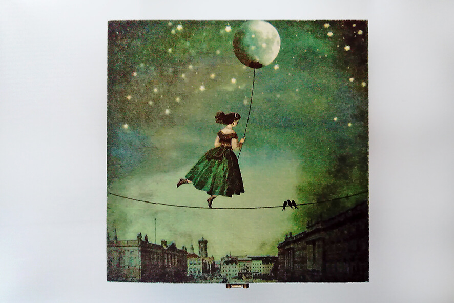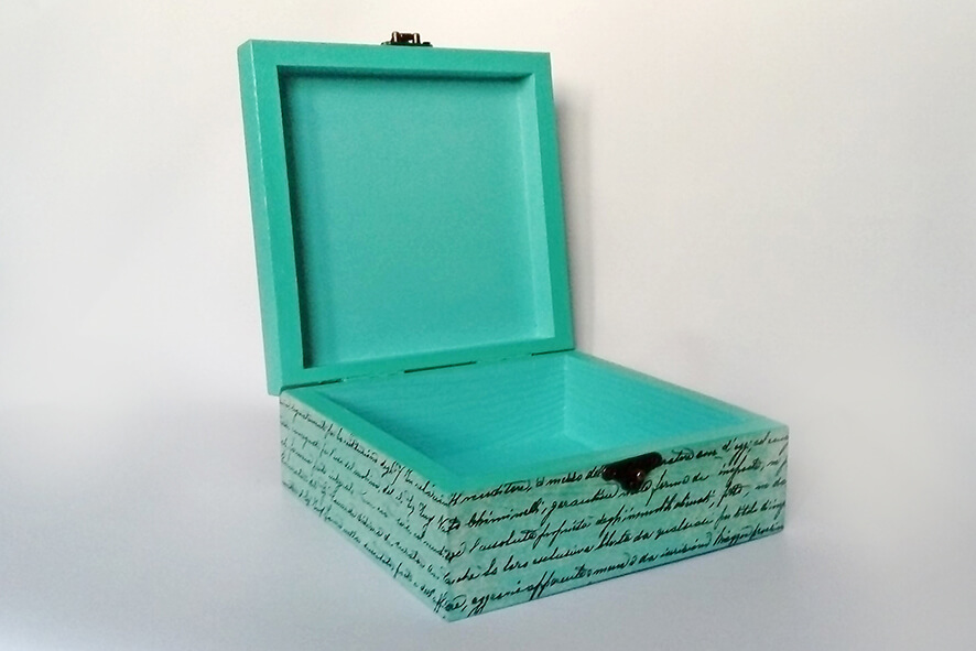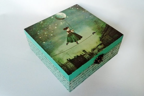 Drewniane pudełko zdobione techniką decoupage. Malowane farbami akrylowymi i pokryte lakierem satynowym. Całość zdobi ozdobne metalowe zapięcie.