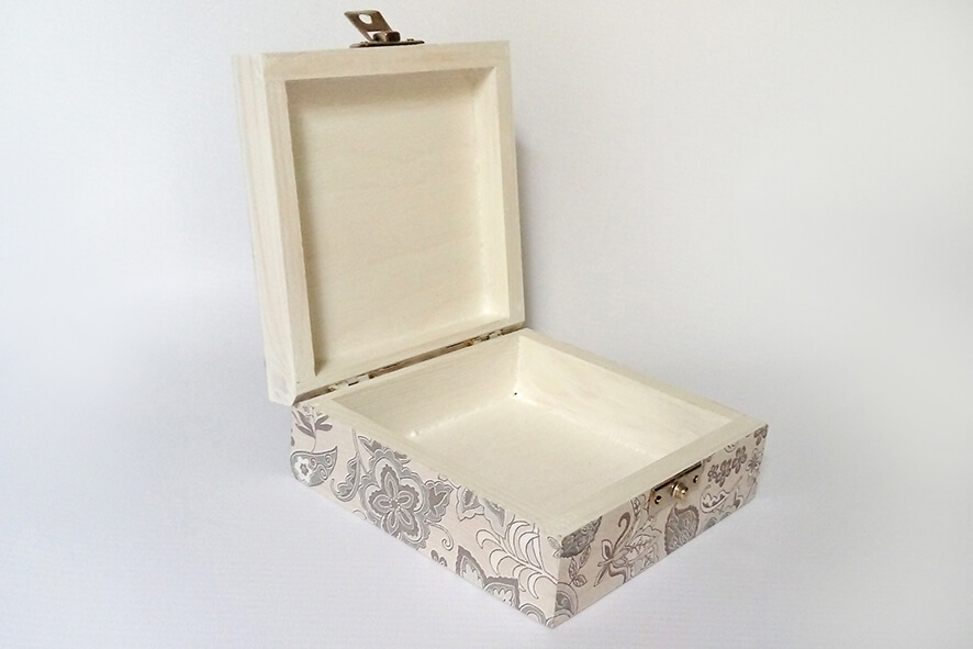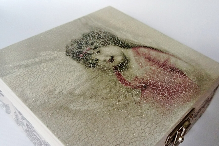 Drewniane pudełko zdobione techniką decoupage. Malowane farbami akrylowymi i pokryte lakierem satynowym. Efekt spękań nadaje pudełku wyjątkowy charakter. Całość zdobi ozdobne metalowe zapięcie.