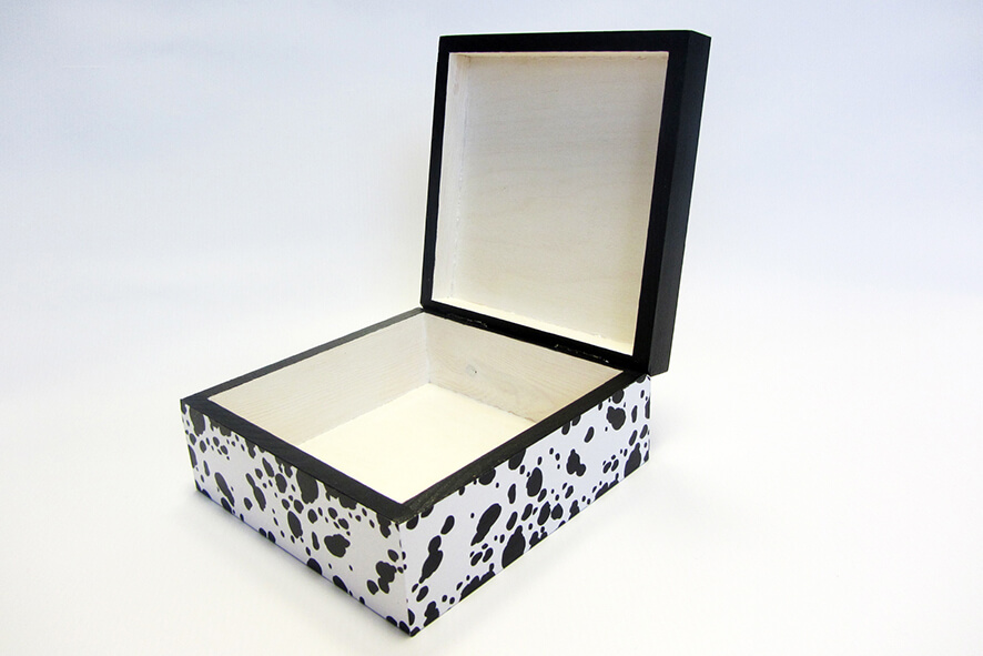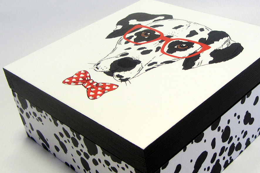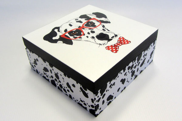 Pudełko dalmat Rozmiar: 16 cm x 16 cm x 7 cm (Dł. x Szer. x Wys.) Opis Drewniane pudełko zdobione techniką decoupage. Malowane farbami akrylowymi i pokryte lakierem satynowym. << wróć do listy