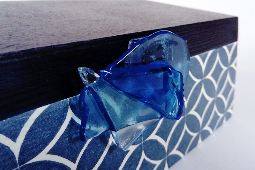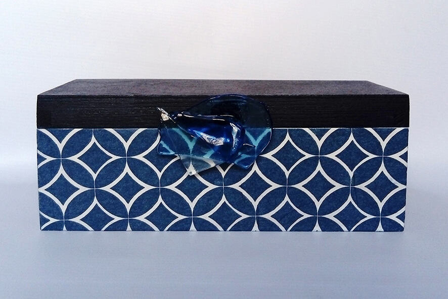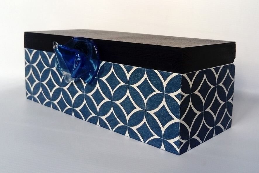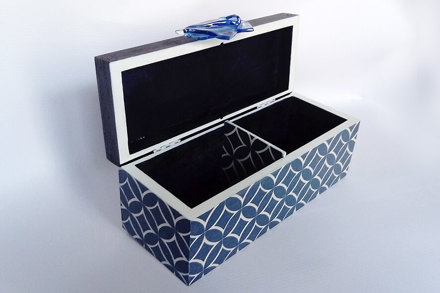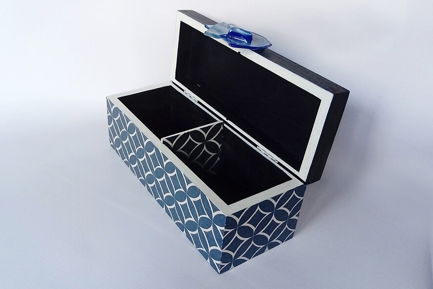 Drewniane pudełko z dwoma przegródkami zdobione techniką decoupage. Malowane farbami akrylowymi i pokryte lakierem satynowym. Całość zdobi unikatowy szklany uchwyt jedyny w sowim rodzaju.