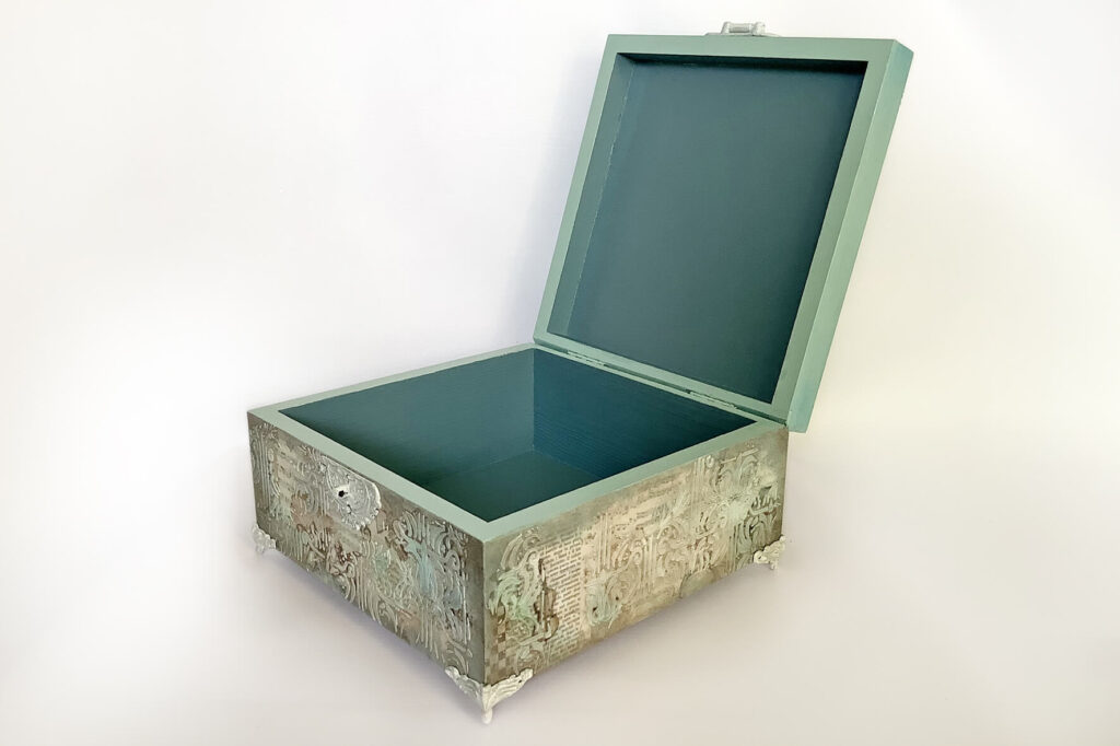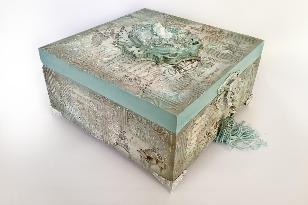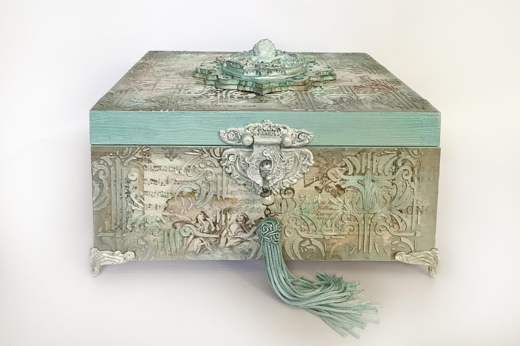Drewniane pudełko zdobione techniką decoupage. Malowane farbami akrylowymi i pokryte lakierem satynowym. Całość zdobią elementy 3D oraz ozdobne metalowe zapięcie z unikatowym wisiorem.