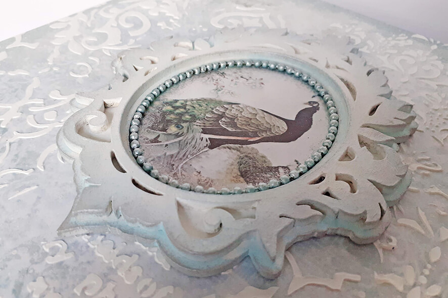 Drewniane pudełko zdobione techniką decoupage. Malowane farbami akrylowymi i pokryte lakierem satynowym. Całość zdobią elementy 3D oraz ozdobne metalowe zapięcie z unikatowym wisiorem.