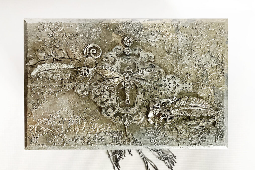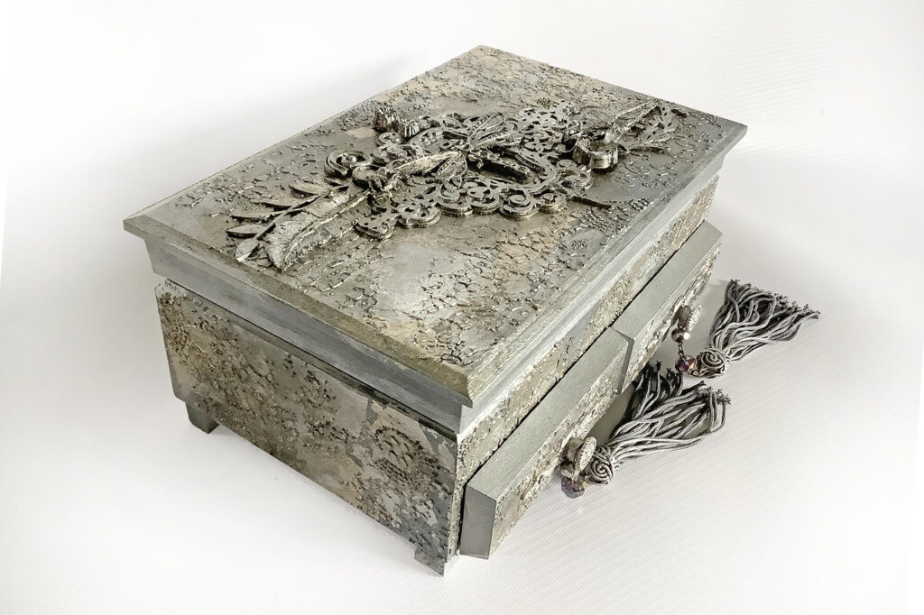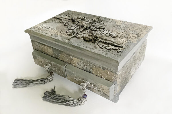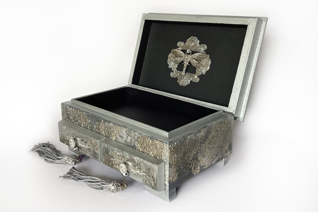 Wyjątkowe pudełko na biżuterię z dwoma szufladkami. Wykonane techniką decoupage i mix media. Na wieczku wizerunek ważki.  Malowane farbami akrylowymi i pokryte satynowym lakierem na bazie wody. Metaliczne farby i płatki srebra podkreślają charakter pudełka.