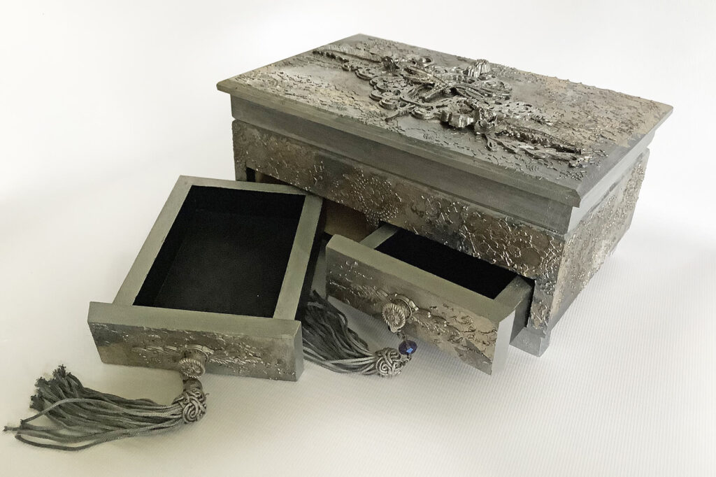 Pudełko z szufladkami w srebrze