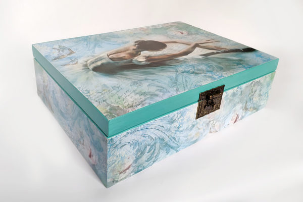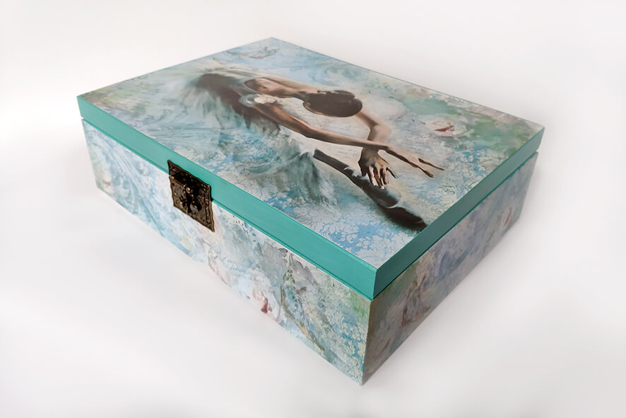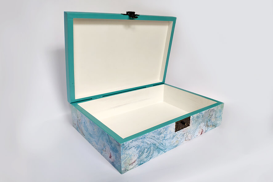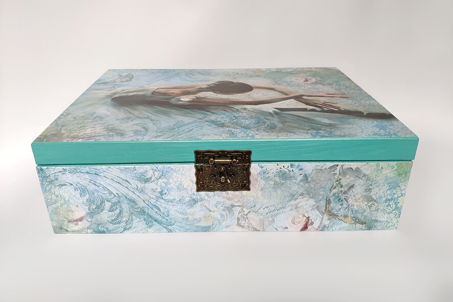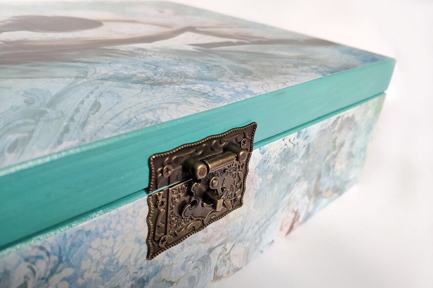 Drewniane pudełko zdobione techniką decoupage. Malowane farbami akrylowymi i pokryte lakierem satynowym. Całość zdobi ozdobne metalowe zapięcie.