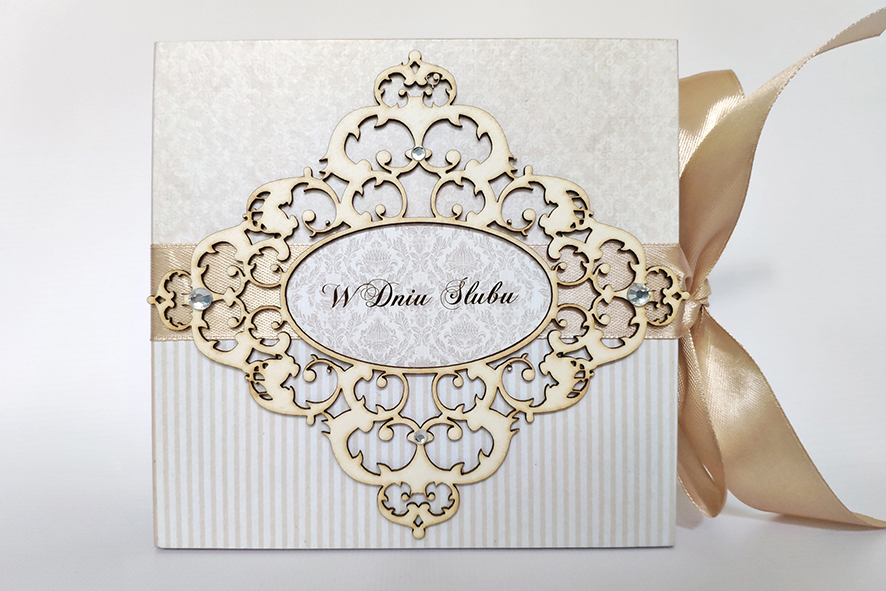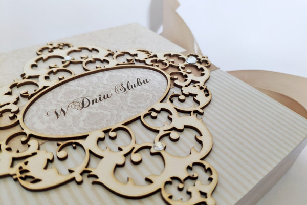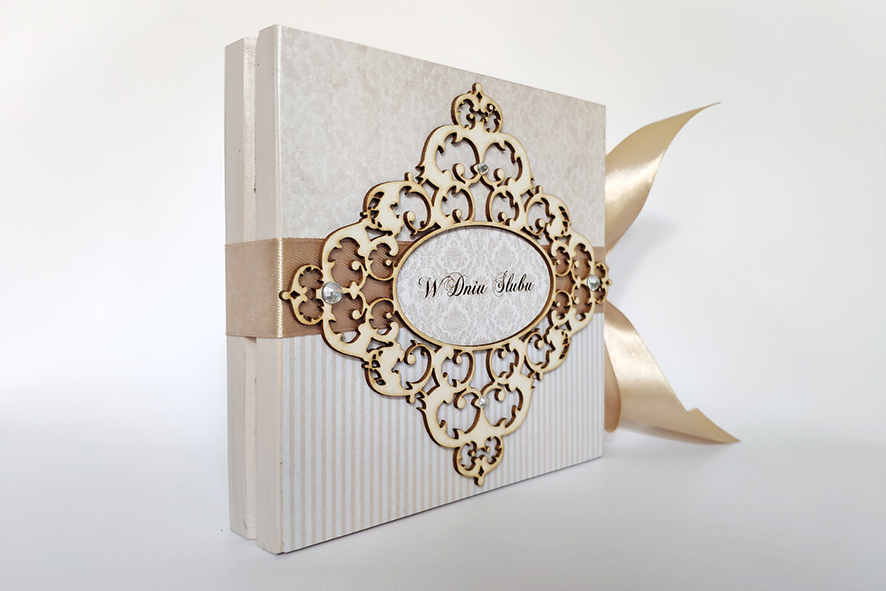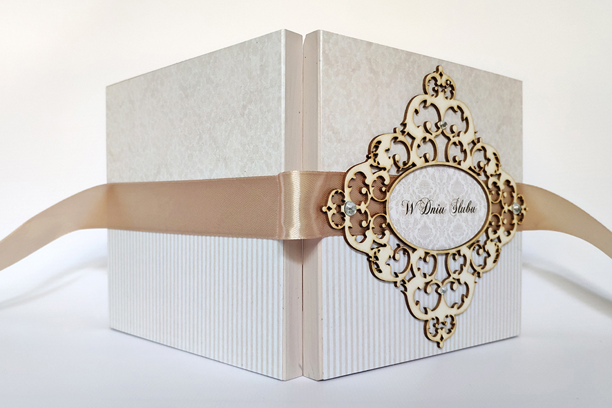 Nietypowa kartka z okazji ślubu, ręcznie robiona w formie drewnianego pudełka. Wykonana techniką decoupage, zdobiona metodą scrapbooking. Malowana farbami akrylowymi oraz pokryta dwukrotnie lakierem bezbarwnym – wodnym, półmatowym. Wiązana na kokardę. Wewnątrz życzenia i miejsce na odręczny podpis, po drugiej stronie mała koperta, która pomieści sporo pieniążków, drobny prezent czy też kartę upominkową.