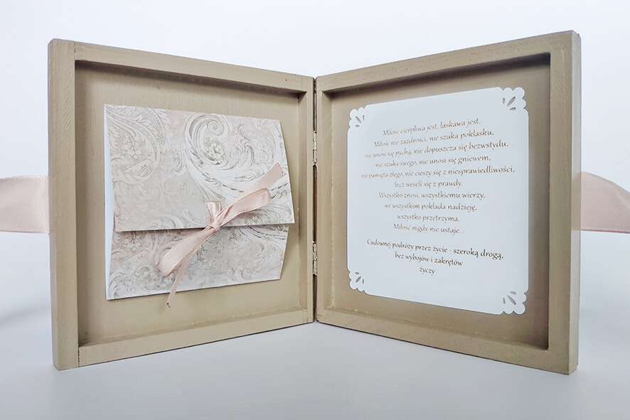Nietypowa kartka z okazji ślubu, ręcznie robiona w formie drewnianego pudełka. Wykonana techniką decoupage, zdobiona metodą scrapbooking. Malowana farbami akrylowymi oraz pokryta dwukrotnie lakierem bezbarwnym – wodnym, półmatowym. Wiązana na kokardę. Wewnątrz życzenia i miejsce na odręczny podpis, po drugiej stronie mała koperta, która pomieści sporo pieniążków, drobny prezent czy też kartę upominkową.