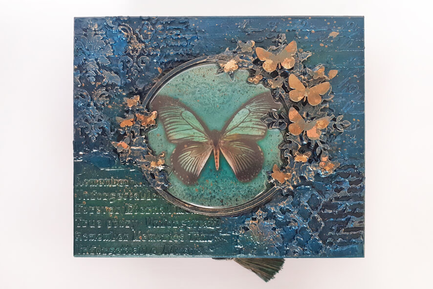 Na wieczku wizerunek motyla w ozdobnym Shaker box z plastikowym szkłem 3D. Malowana farbami akrylowymi i pokryta satynowym lakierem na bazie wody.