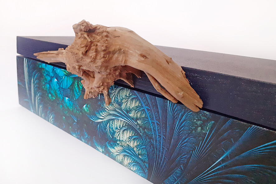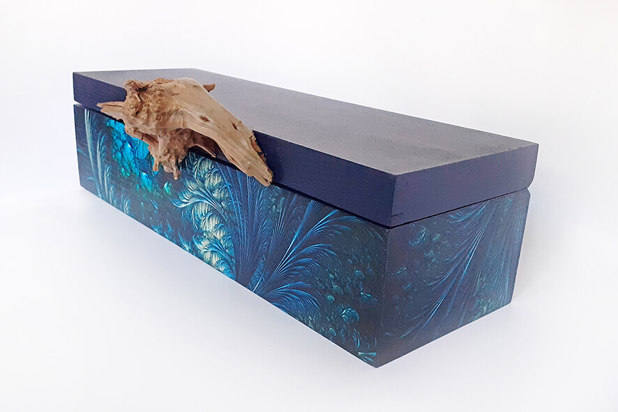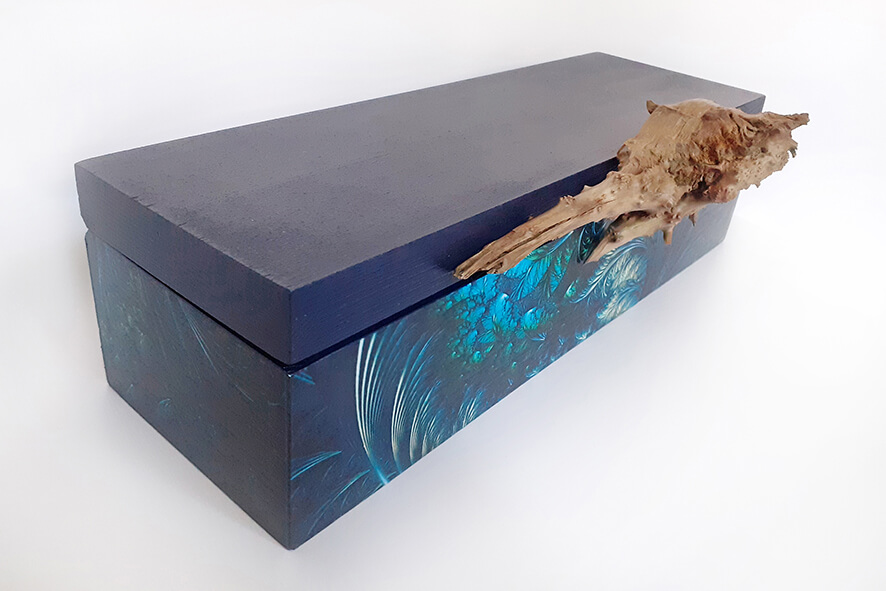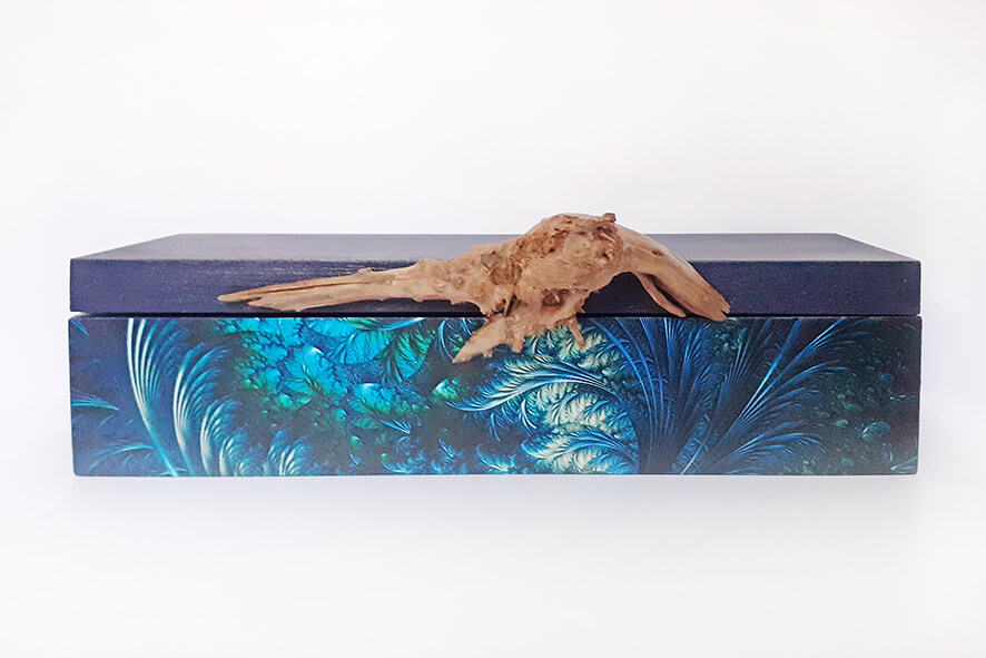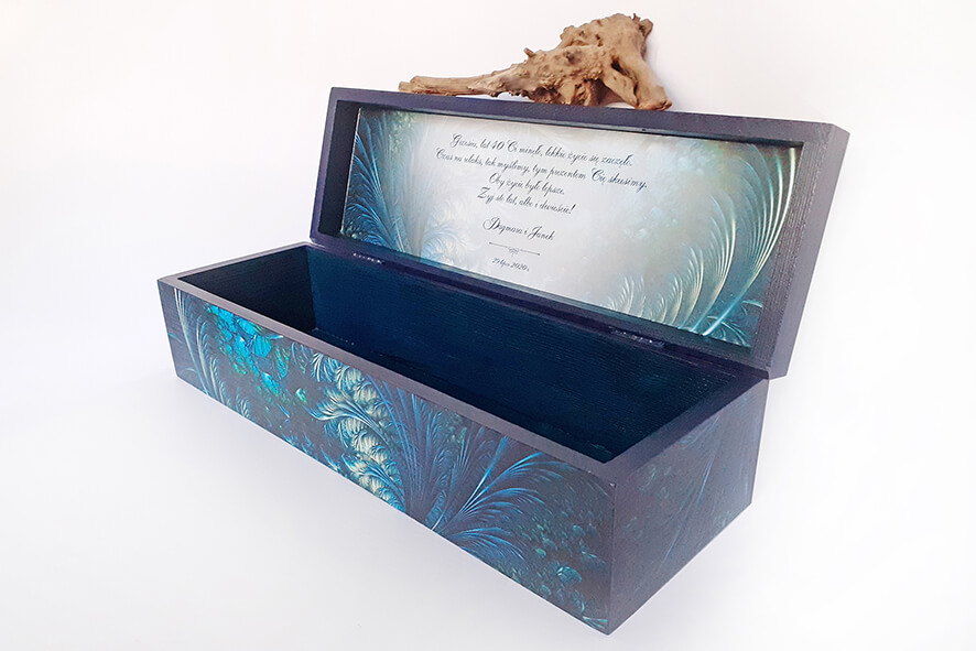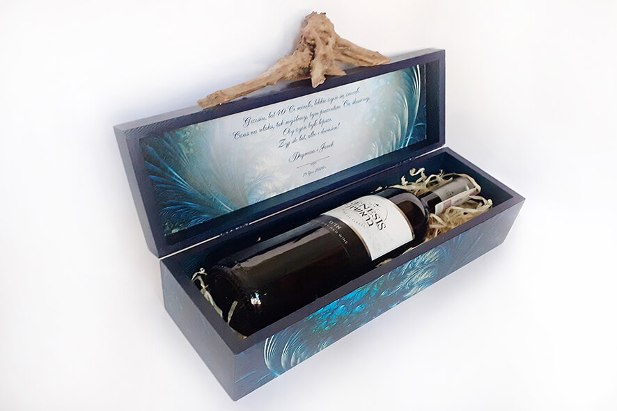 Drewniane pudełko na wino lub inny alkohol, zdobione techniką decoupage. Malowane farbami akrylowymi i pokryte lakierem satynowym. Całość zdobi unikatowy drewniany uchwyt jedyny i nie powtarzalny.
