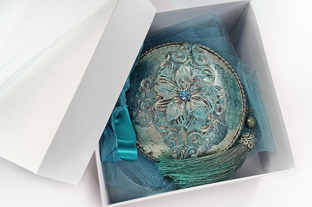 Unikatowa bombka, medalion, zapakowana w kartonowe pudełko wykonane pod wymiar.