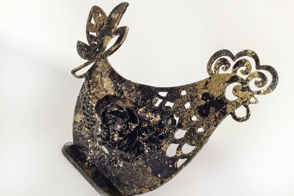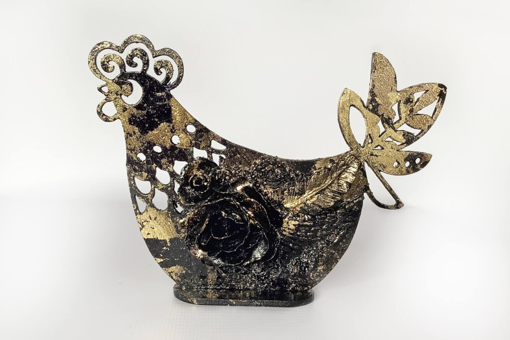 Złota kurka Rozmiar: 18 cm x 14 cm x 10 cm (Dł. x Szer. x Wys.) Opis Dekoracyjny wielkanocny stojaczek – złota kura. Wykonany metodą decoupage i mixmedia. << wróć do listy